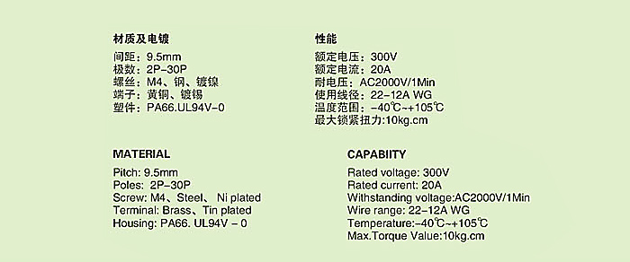 間距:9.5mm;極數(shù):2P-30P;額定電壓/電流:300V/20A